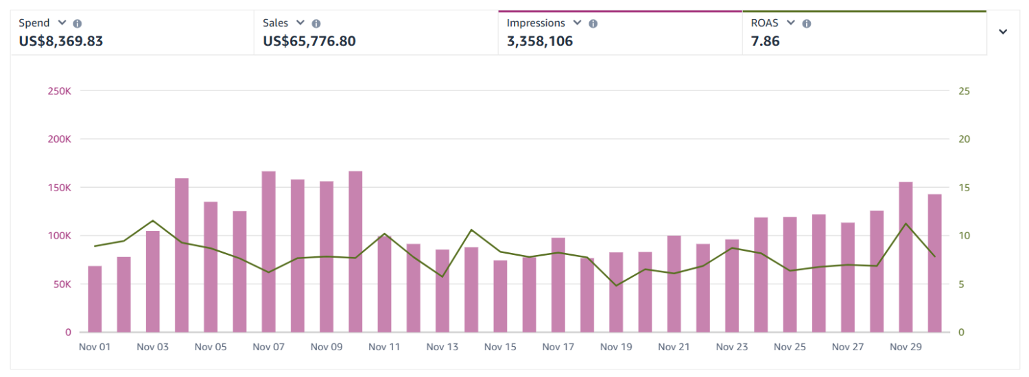 In November 2024, the campaign continued to drive strong results, generating $65,776.80 in sales from a spend of $8,369.83, achieving a ROAS of 7.86. The campaign garnered over 3.3 million impressions, indicating sustained visibility. Strategic budget allocation and engaging ad creatives played a crucial role in maintaining high performance. Sales peaked during key shopping days, leveraging consumer demand and timely promotions.